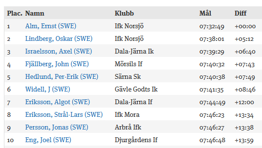 The track from Oxberg passed Gopshus by and the unofficial time checkpoints in Hökberg and Läde, where Ernst Alm held the lead. At Eldris station there was a secret checkpoint that gave warning to the finish line. When Ernst Alm passed at 13:01 his start number 114 was put up on big notice boards at the finish in Mora. It took ten minutes for another number to appear, meaning that Alm had a large lead. At the last secret checkpoint in Selja, hardly four km from the finish, Alm found out that he first. He then held a clear lead ahead of his clubmate Oskar Lindberg.